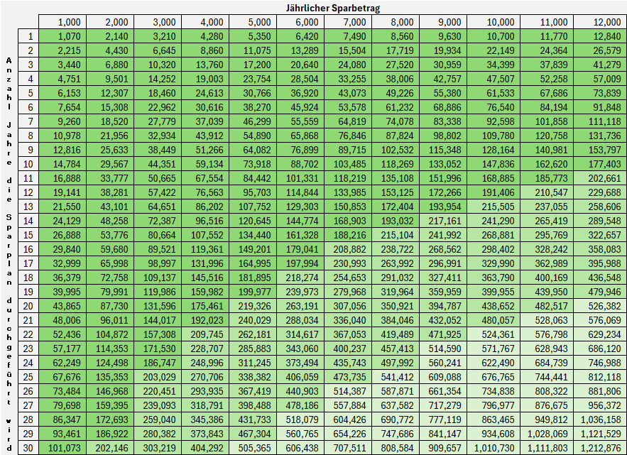 Schau dir die nachfolgende Übersicht an und du wirst sehen, dass über die Zeit doch beträchtliche Summen zusammenkommen. Sparst du pro Jahr bspw. 1,000 EUR per ETF und ziehst den Sparplan für 30 Jahre durch, dann wird dein ETF nach Ablauf von 30 Jahre auf 101,073 EUR angewachsen sein.