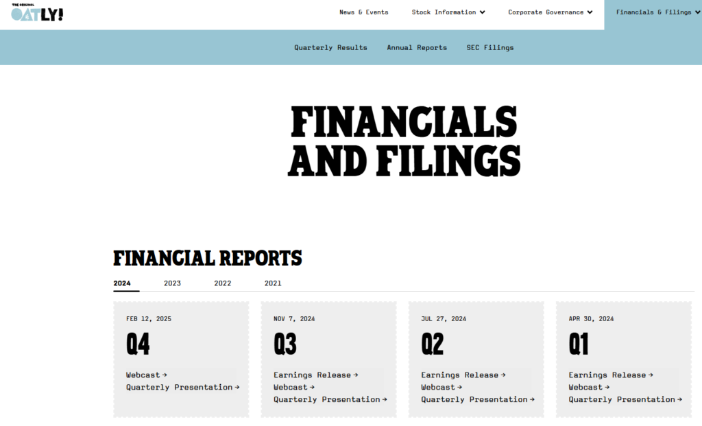 Besuchst du bspw. die Internetseite von Oatly findest du schnell den Bereich „For Investors“. In diesem Bereich stellt das Unternehmen Informationen für dich bereit. An Unterlagen von anderen Firmen kommst du auf einem ähnlichen Weg – Webseite aufrufen, nach Investoreninformationen suchen und dann einfach mal die Zahlen anschauen. Bei Oatly sieht die Seite jedenfalls wie folgt aus.