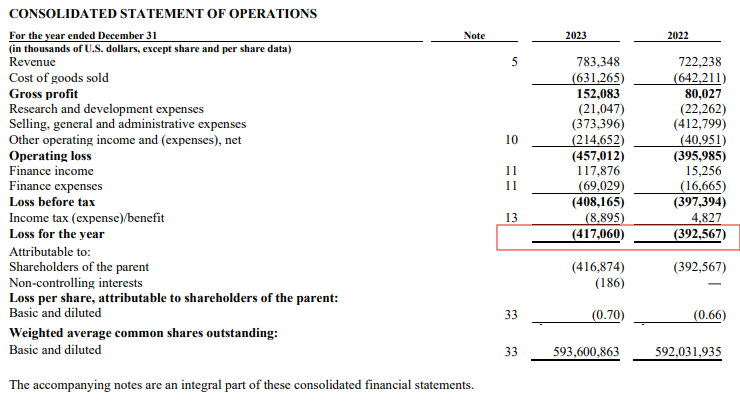 Unter den „Revenues“ versteht man die Umsatzerlöse. Hier ist im Jahresvergleich eine Verbesserung erkennbar. Durch den Verkauf der Hafermilchprodukte konnten die Umsatzerlöse von 643 Mio. USD auf 722 Mio. USD gesteigert werden. Für dich habe ich rot markiert, was dich immer interessieren sollte. Hat die Firma profitabel gearbeitet? Was bleibt am Ende des Tages für mich und die anderen Investoren übrig? Wie du siehst hat Oatly in beiden Jahren enorme Verluste gemacht. Damit sollte dir klar sein, dass dein Investment schon als relativ risikoreich einzustufen war. Wer soll dir denn deine Aktien später mal abkaufen, wenn das mit den Verlusten so weitergeht? Du hattest ja um die 115 EUR pro Aktie bezahlt. Denkst du ein neuer Käufer wird dir mehr geben oder wird er dir nicht eher weniger Geld, bspw. 60 EUR anbieten, weil das Geschäftsmodel nicht so richtig funktioniert?