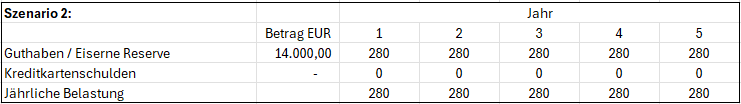 Das zweite Szenario basiert auf dem ersten Szenario. Wenn du dir die Zahlen ansiehst, dann stellst du fest, dass die „Eiserne Reserve“ angetastet wurde. Insgesamt wurden 6.000 EUR verwendet um die Kreditkartenschulden zu tilgen. War das ein Fehler? Schau dir mal die jährlichen Belastungen der beiden Szenarien an.