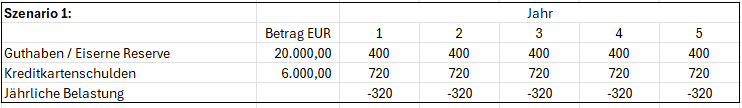 Im ersten Szenario hast du 20.000 EUR angespart und befindet sich aber mit 6.000 EUR bei deiner Kreditkartenfirma in der Kreide. Wie du erkennen kannst, erzeugt dein Guthaben kaum Zinsen während du aber für deinen Kredit jährlich doch ordentlich was an Zinsen bezahlen musst. Und dass, obwohl dein Kreditbetrag im Vergleich zu deinem Guthaben doch recht überschaubar ist.